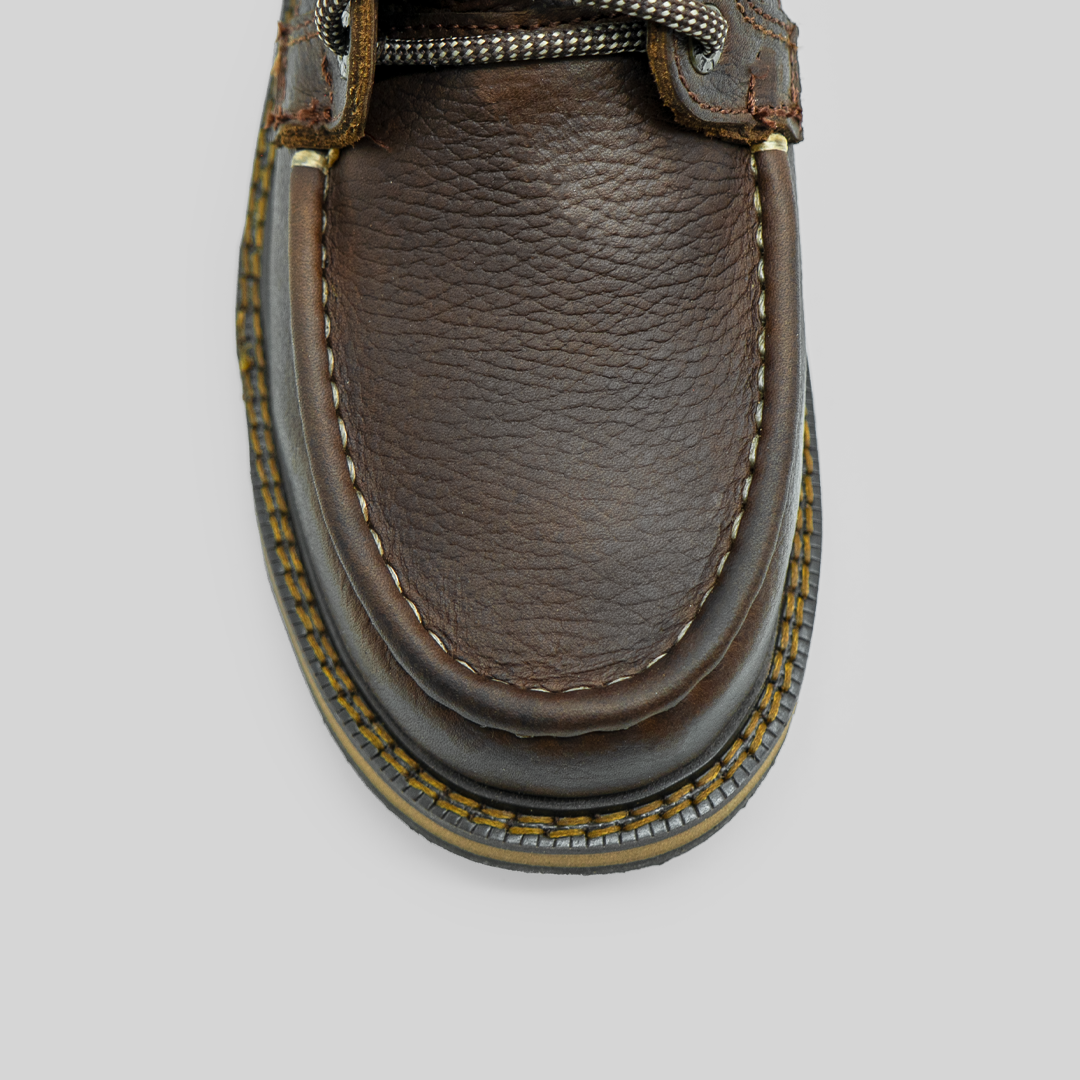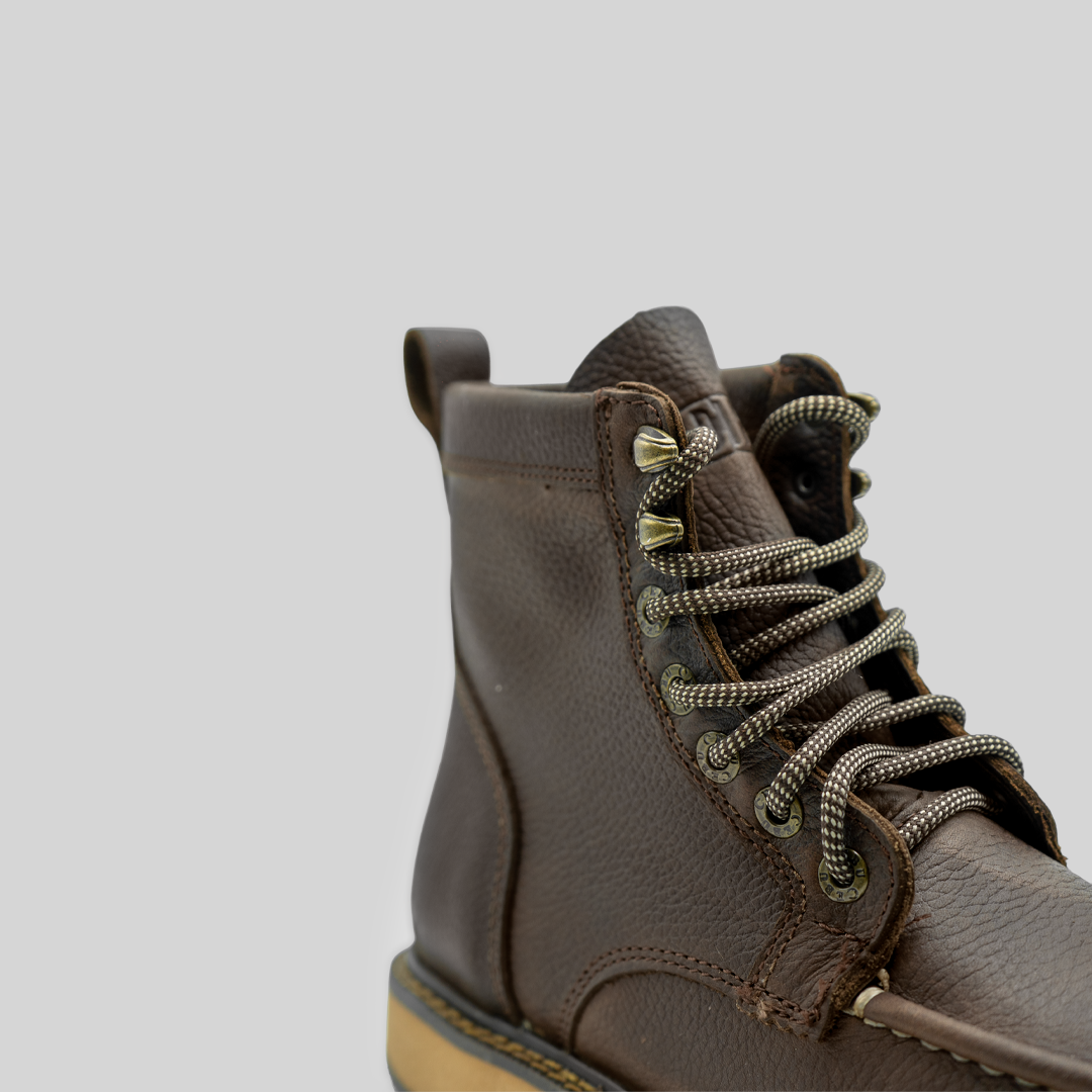 El Moc-W Toe Café equilibra fuerza y autenticidad con un toque clásico. Elaborado en piel floter café oscuro, destaca por su alta resistencia, durabilidad y una textura natural con acabado encerado que mejora con el uso. Está montado sobre una suela Cactus Moka, ligera y con excelente tracción en cualquier terreno, mientras que su plantilla preformada con cambrillón ofrece soporte anatómico y comodidad prolongada durante toda la jornada.