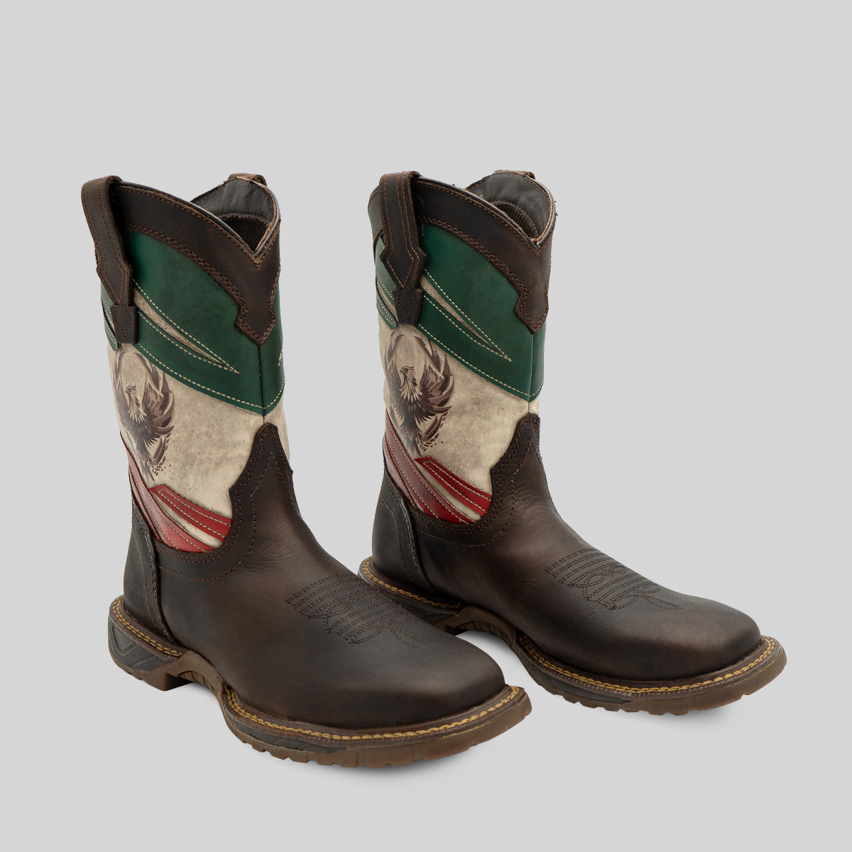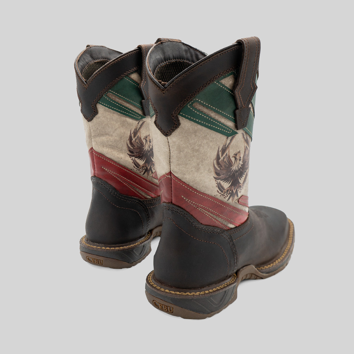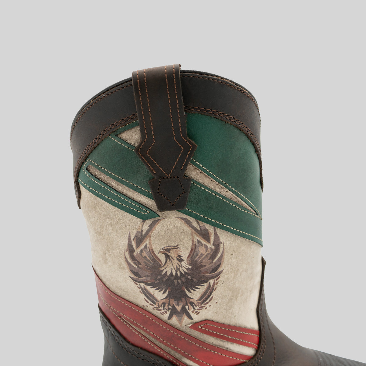 Celebra el mes patrio con estilo y orgullo. Estas botas de tubo alto, inspiradas en la bandera de México, presentan los colores verde, blanco y rojo con un águila en el centro. Hechas en piel color café, ofrecen una suela EVA super ligera y cómoda con punta cuadrada, ideales para destacar en cualquier ocasión.