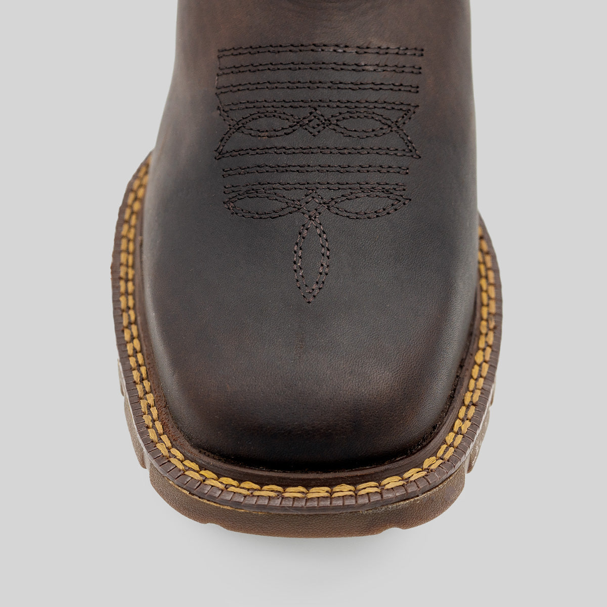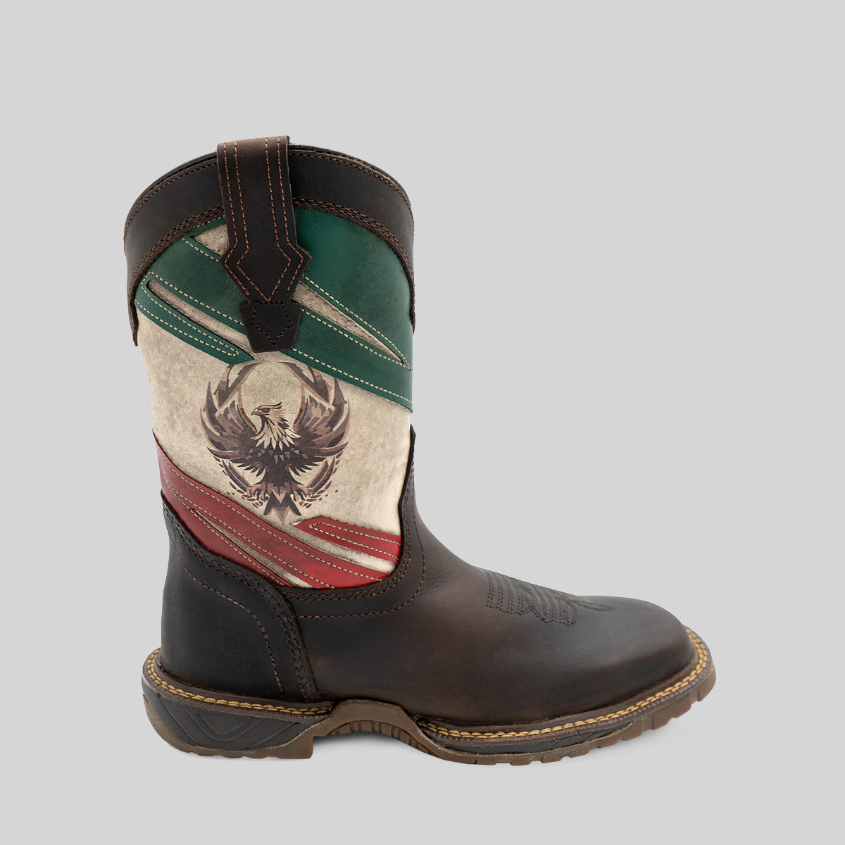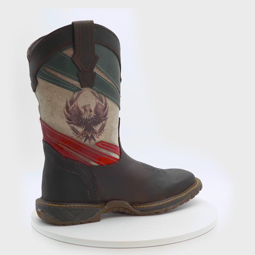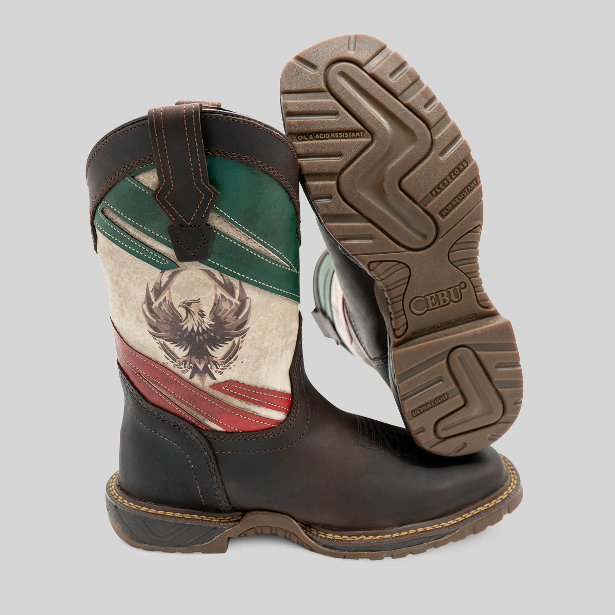 Celebra el mes patrio con estilo y orgullo. Estas botas de tubo alto, inspiradas en la bandera de México, presentan los colores verde, blanco y rojo con un águila en el centro. Hechas en piel color café, ofrecen una suela EVA super ligera y cómoda con punta cuadrada, ideales para destacar en cualquier ocasión.