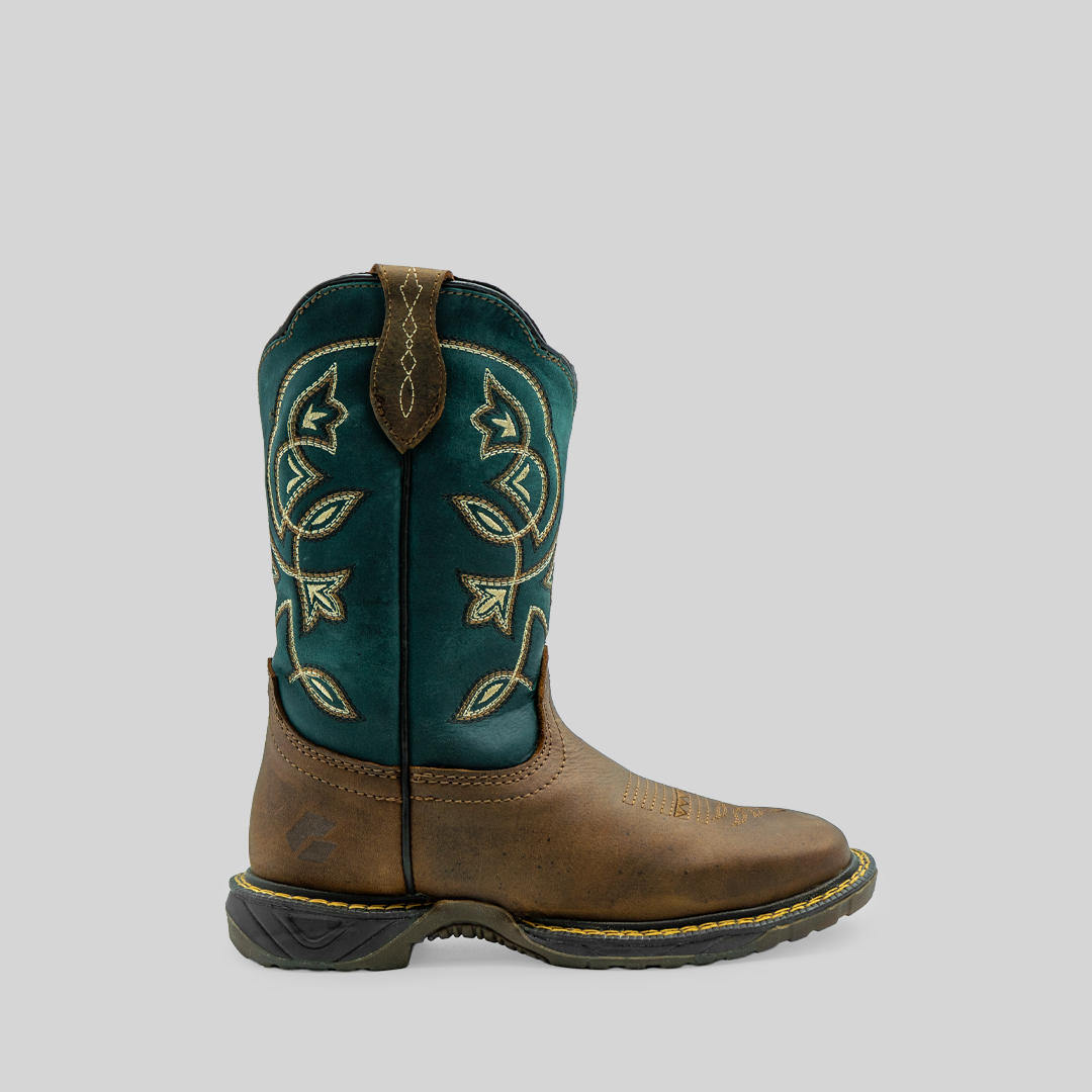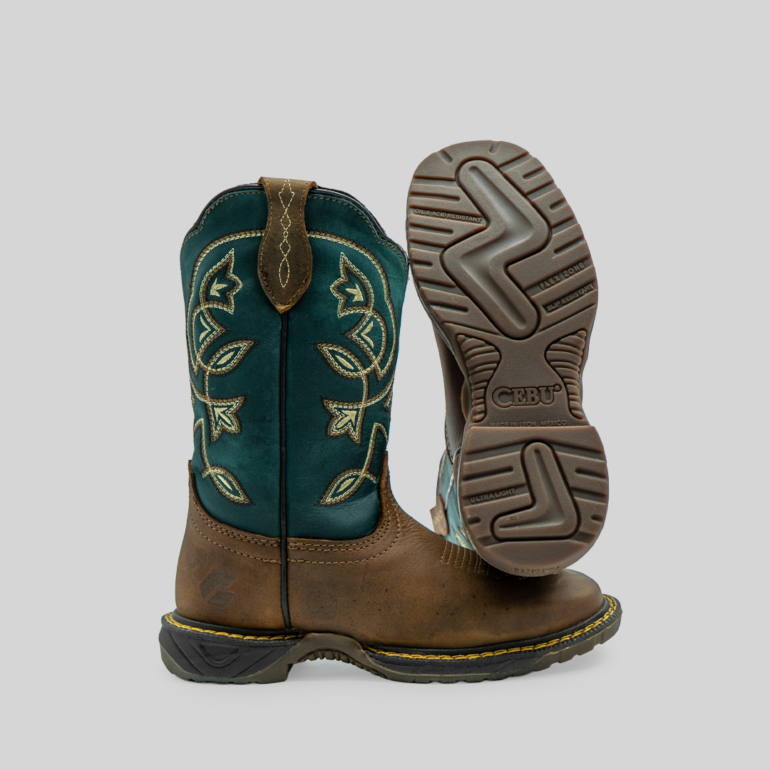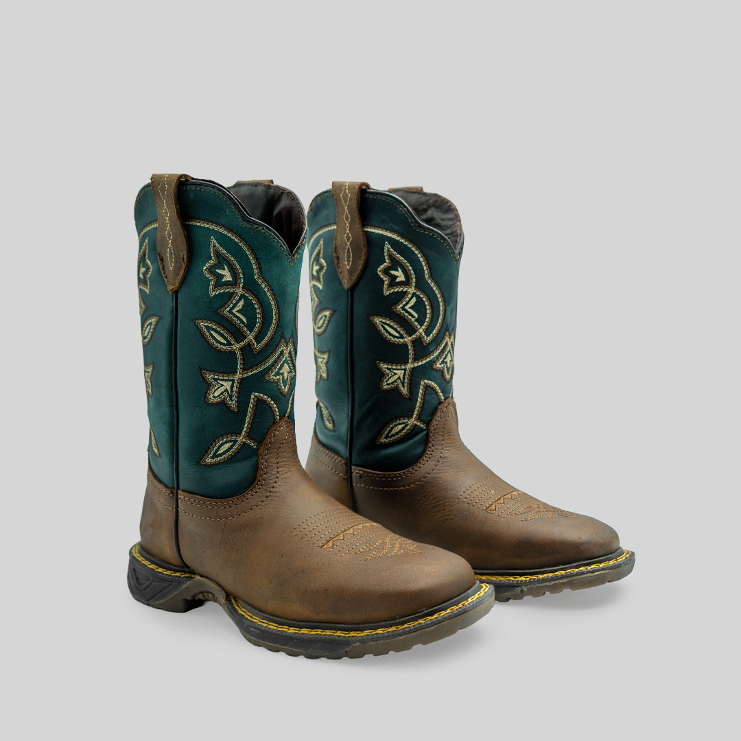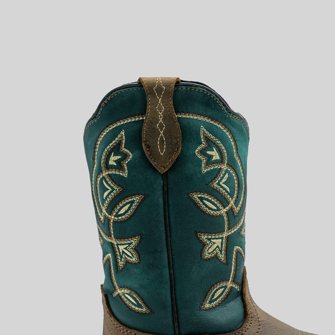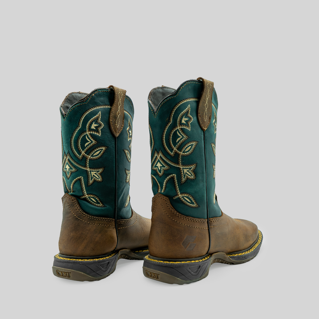 Bota para dama Suculenta, fabricada en piel, con tubo verde y base color tan que resalta por su contraste. Diseño con bordados florales, suela resistente y ajuste cómodo para máxima durabilidad y estilo.