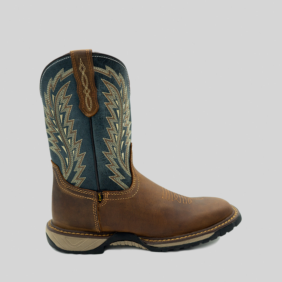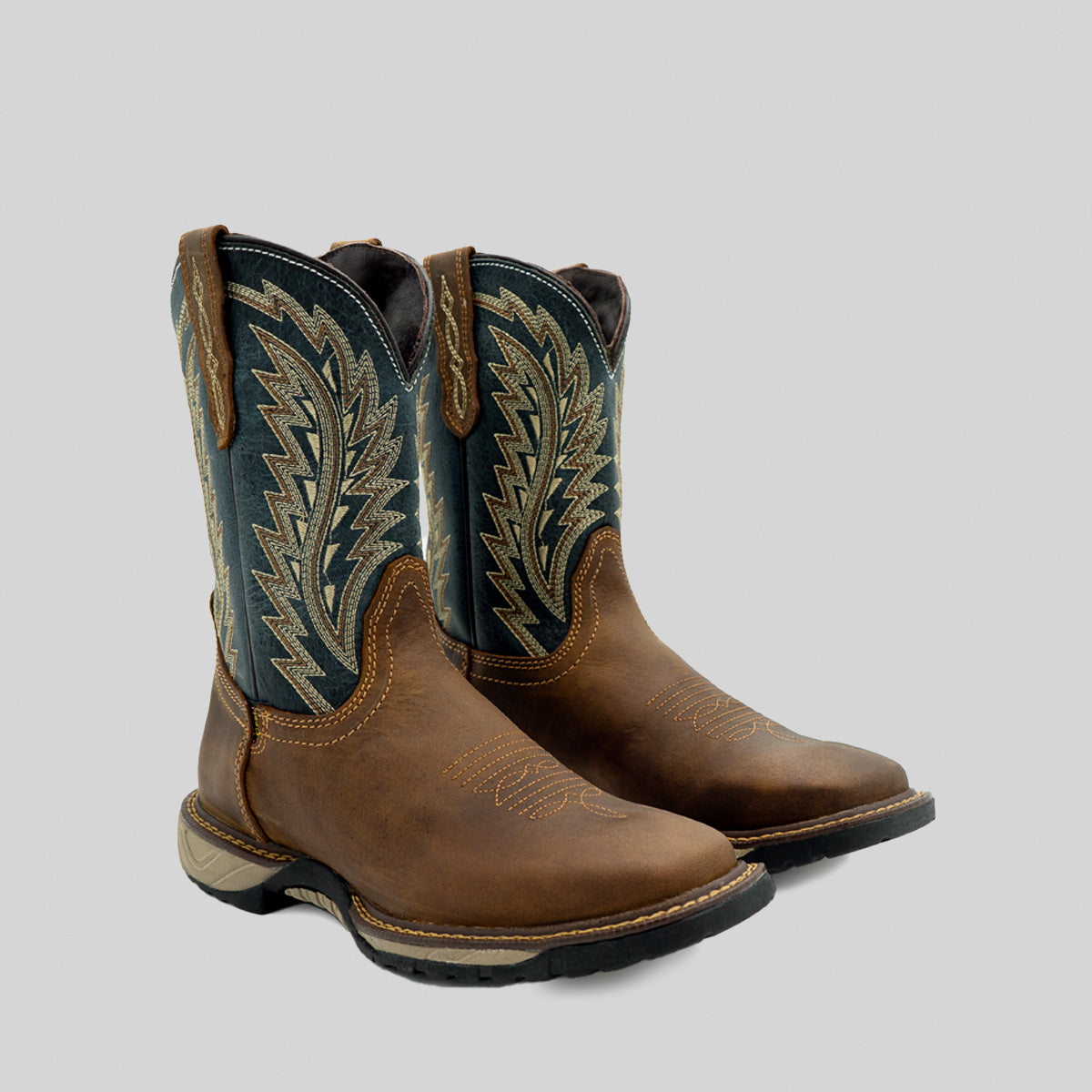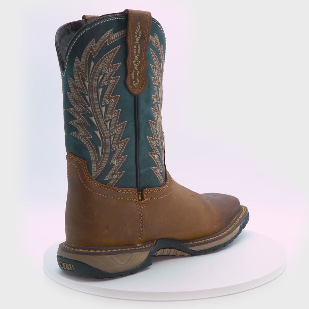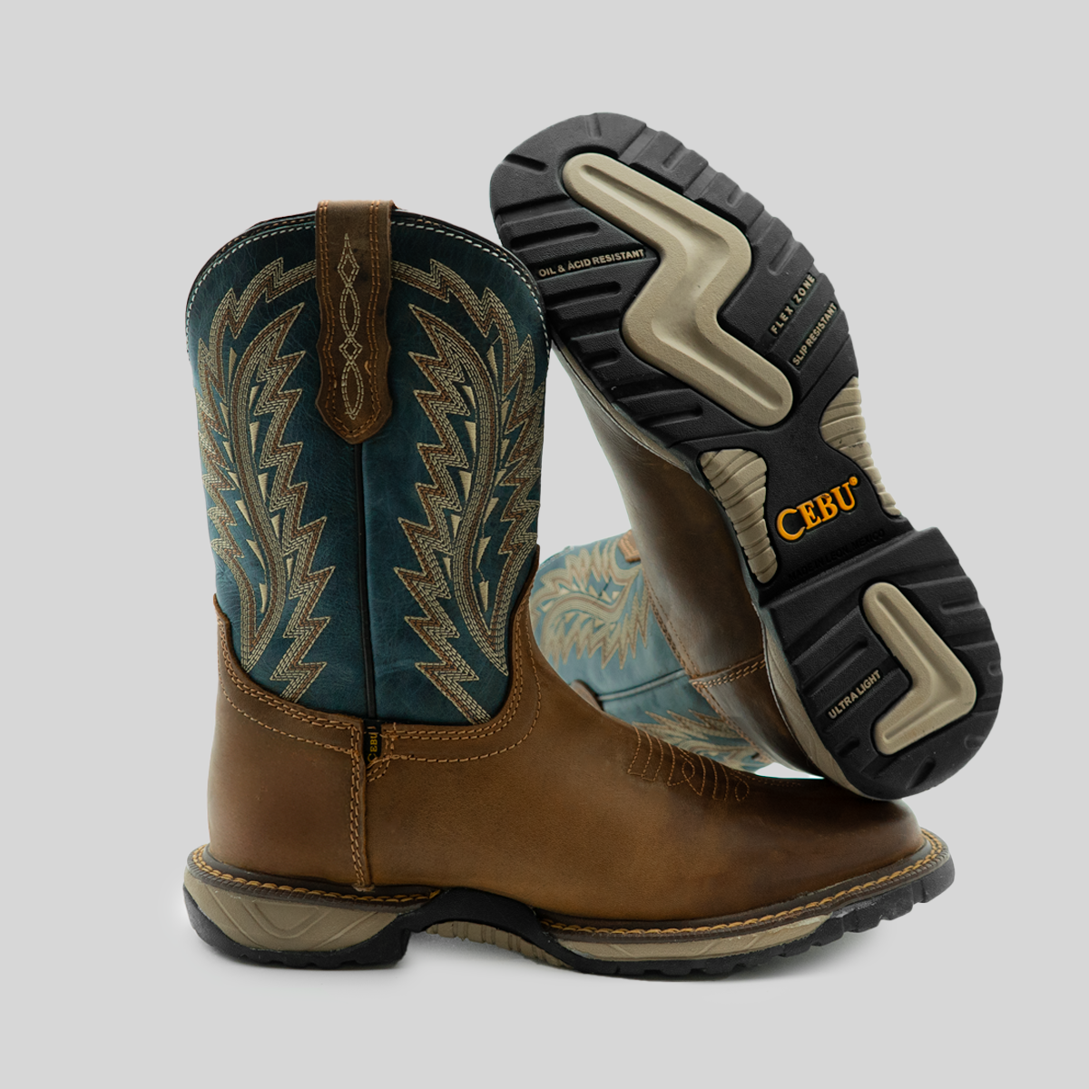 Destacando por su diseño robusto y moderno, con costura que refleja su alta calidad. El tubo verde aqua contrasta elegantemente con el marrón cálido, y los bordados beige con matices verdes añaden sofisticación y detalle. Estas botas son ideales para quienes buscan resistencia y funcionalidad con un diseño único y atractivo.